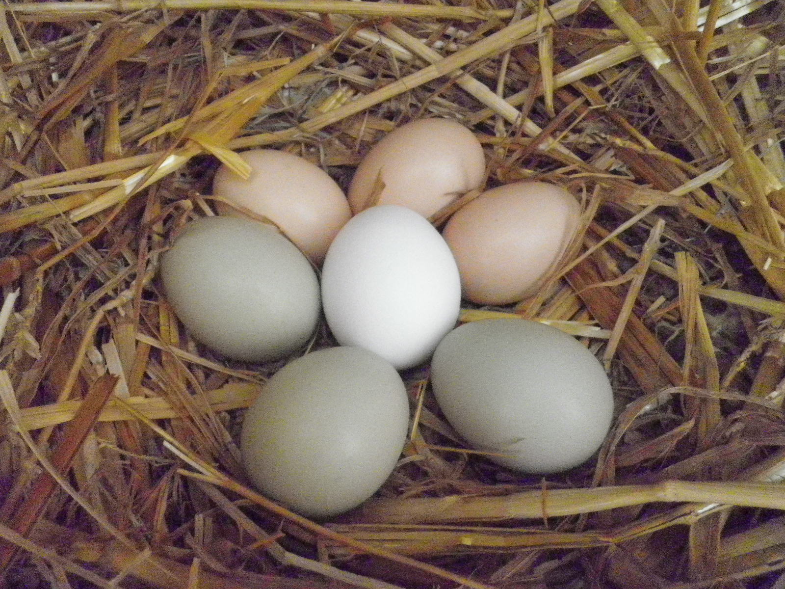 Il nostro pollaio composto da circa 35 animali tra ovaiole e galli, tutti, o quasi, nati in loco sono di varie razze, ma spiccano principalmente ecotipi (incroci) locali (del pollaio). La biodiversità del nostro pollaio la si può anche apprezzare dalla colorazione del guscio delle uova. Le nostre uova non sono tra loro di identico colore, ma i colori spaziano dal celeste, al verde , al verde scuro, al cioccolato, al rosa e al bianco. Ugualmente si può dire della grandezza. Ce ne sono di piccole di medie e di grandi, ma il tuorlo, grosso modo, pesa sempre intorno ai 18 grammi, indipendentemente della grandezza del guscio.